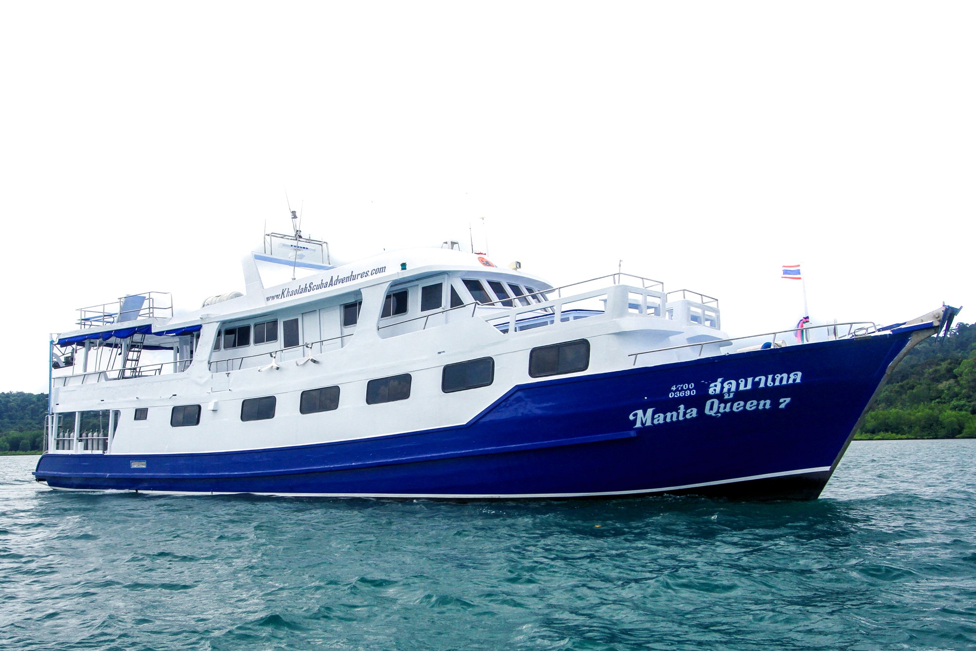 | More Detail | Manta Queen 7 accommodates 22 guests in comfortable air conditioned Twin non ensuite, 4 bed share non ensuite, double ensuite, twin ensuite cabins. Our liveaboard vessel is a 27 meters long and 5 meters wide wooden hull built boat that is manned with 4 dive staff and 6 boat crew. There is plenty of space to enjoy the time in between dives in the saloon with HD-TV, the open dining area or on the large sundeck. All meals on board are served buffet style freshly cooked from the on board chef. Snacks and fruits are served in between dives. The dinghy gives you the opportunity to spend some time on the beautiful beaches. Nitrox is also available onboard as well as Nitrox courses (EAN) and a wide range of PADI Courses i.e. Open Water Course, Advanced Open Water Course, Deep Speciality and many more. 19 world class dives at Thailand´s premier dive destination. DIVE - EAT - SLEEP – REPEAT |
